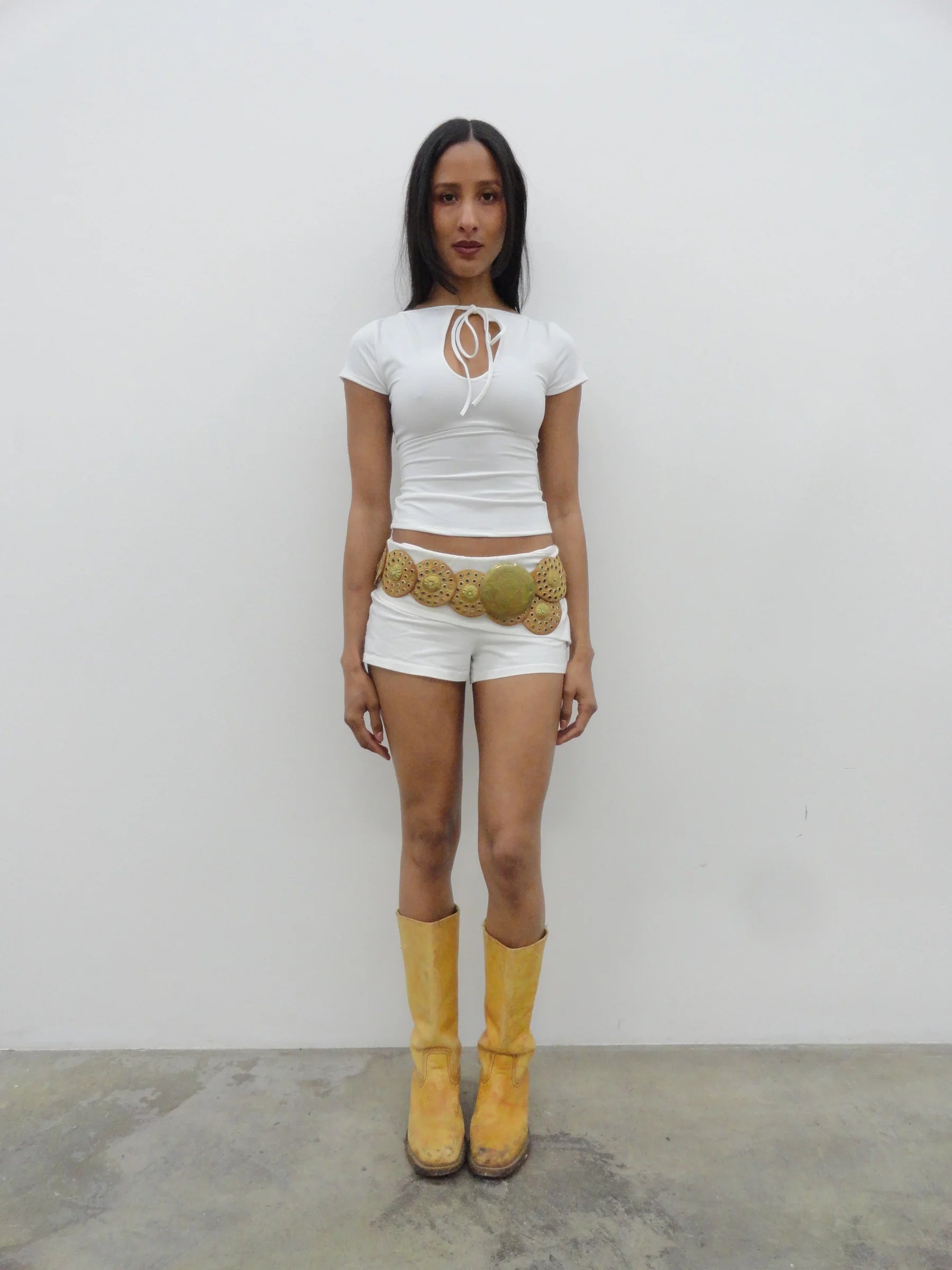 Short sleeve keyhole top with bow tie closure in a deadstock ultra soft, sculpting, and stretchy black eclat fabric.