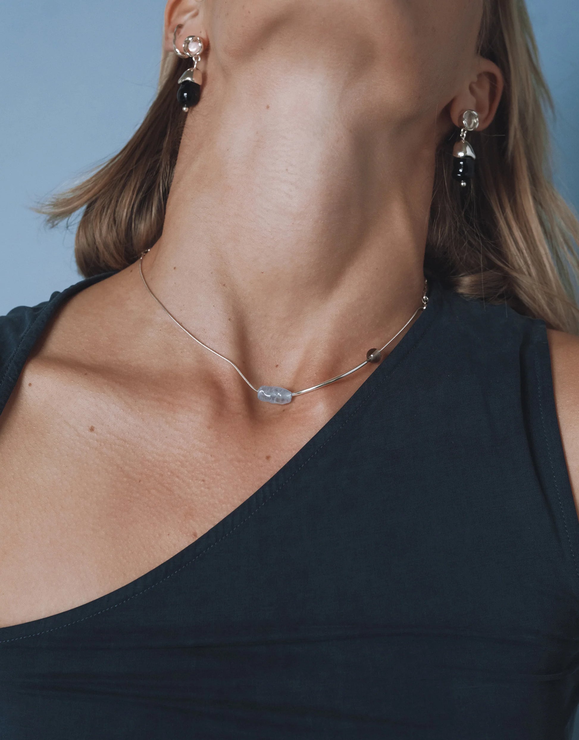 Still Necklace blends soft rhythm and contrast through fluid silver curves, delicate chain links, and hand-shaped glass beads. Its asymmetrical design reflects a quiet sense of movement and balance, like a slow breath or a gentle wave. A minimal yet expressive piece to wear with ease.