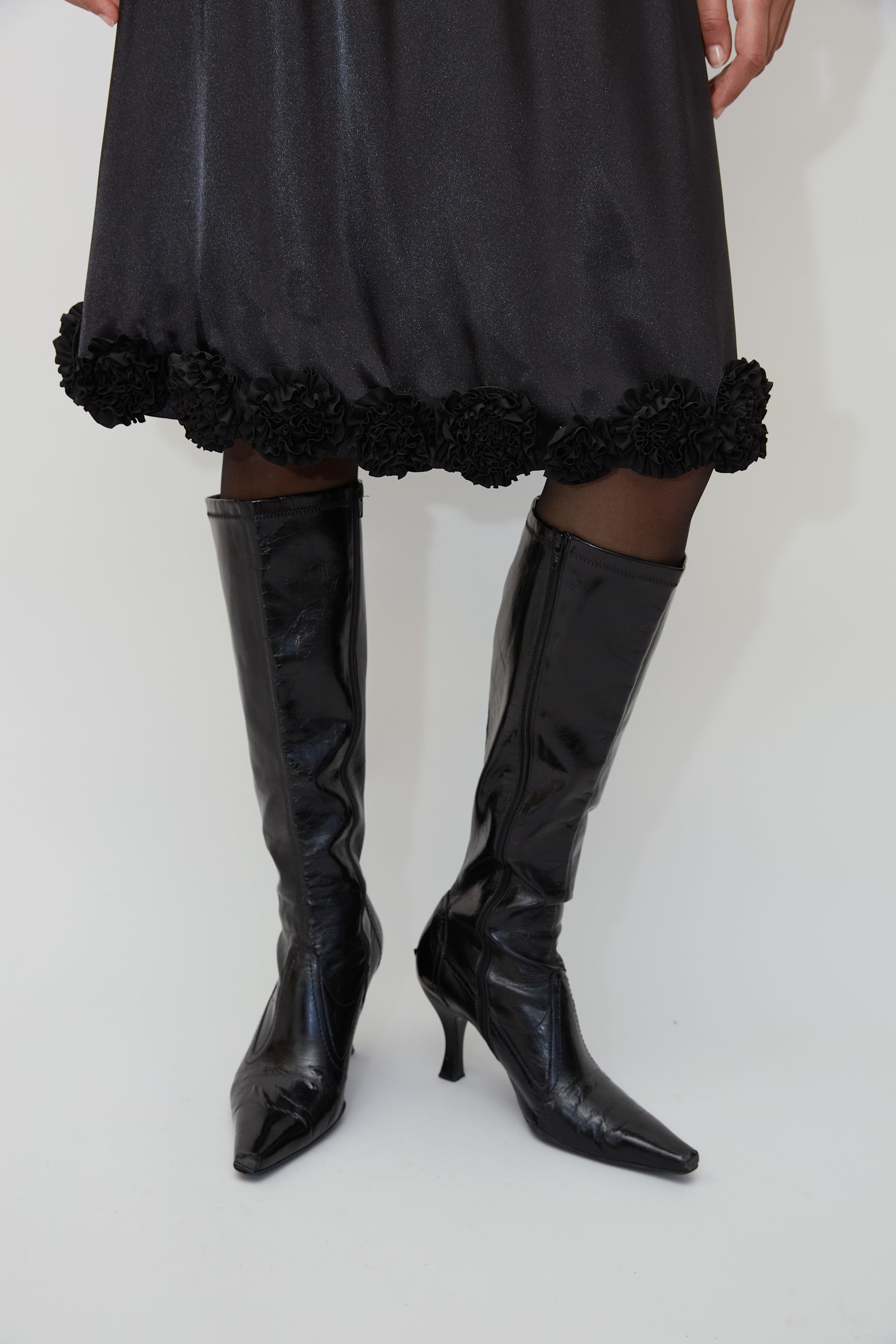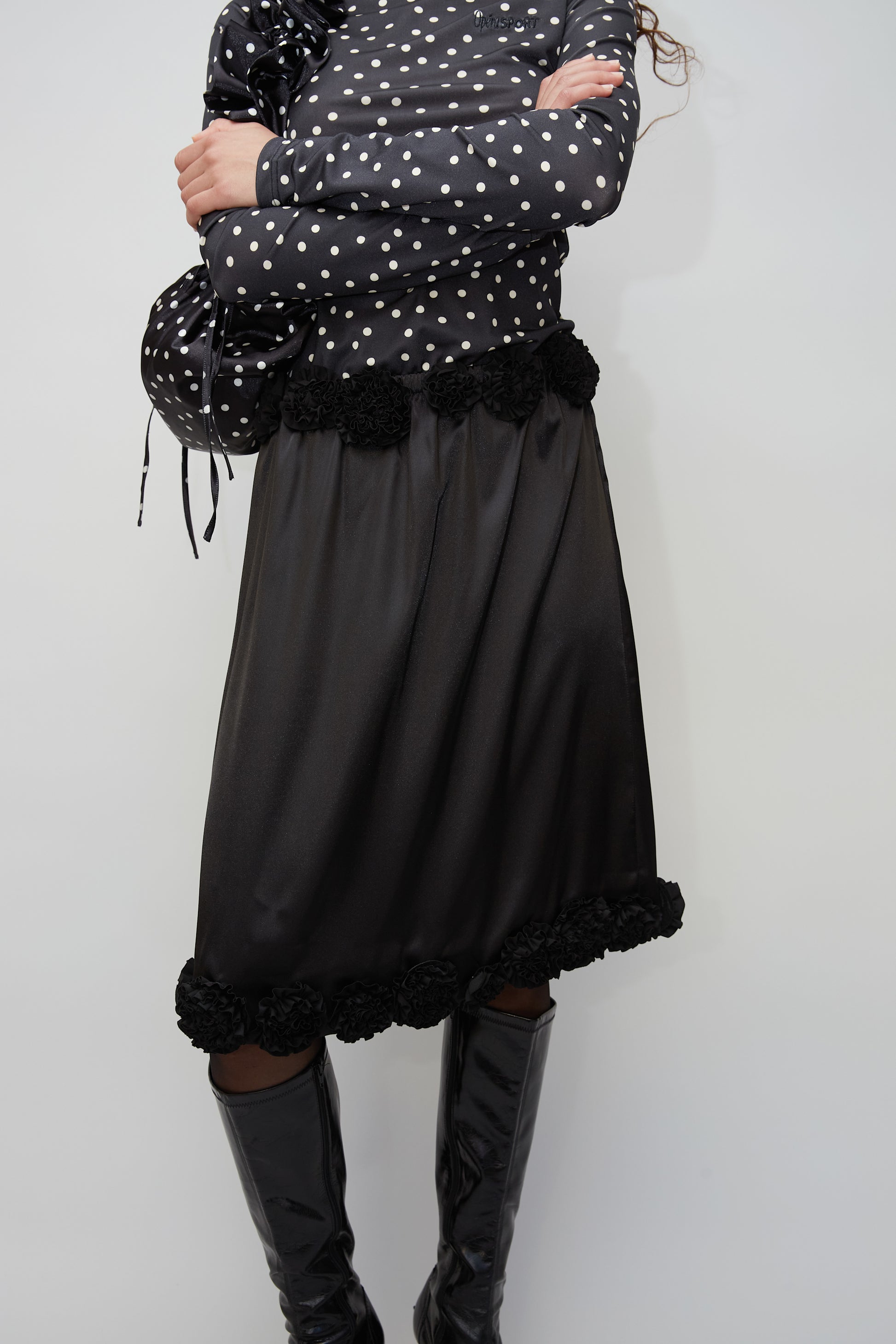 The Hana Skirt is crafted from 100% recycled polyester in black. Designed with decorative floral details at the waist and bottom, it brings a feminine touch to its sleek midi silhouette.