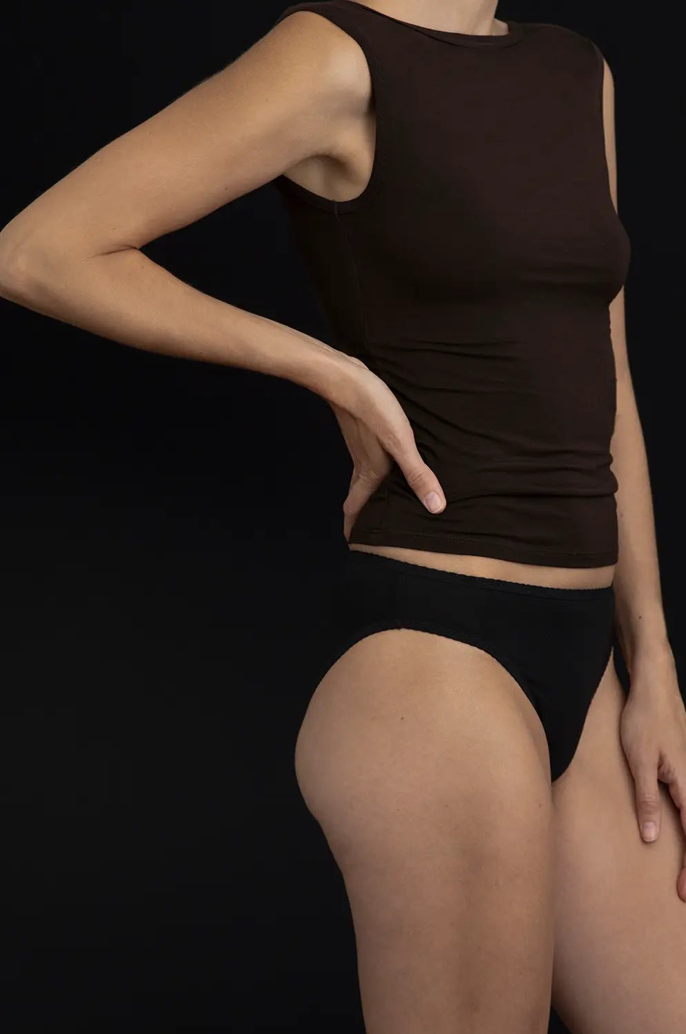 Elegant wide neckline sleeveless tank, open back, fitted silhouette, perfect hip length. Made from a luxuriously soft, environmentally-conscious bamboo.