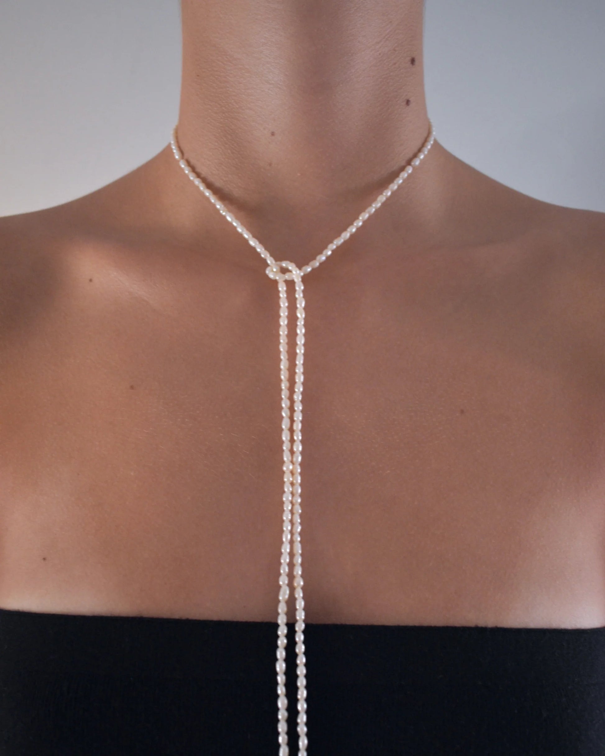 Siau necklace is meticulously handmade with small baroque rice-shaped freshwater pearls as a long ribbon that can be wrapped around your neck or waist to create the most stylish looks that you can pull off.