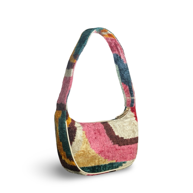 Loop is a curved silhouette crafted from handwoven silk sourced from Uzbekistan and meticulously crafted by artisans in Istanbul. Its soft, tactile texture and bold geometric pattern reflect a harmonious blend of heritage and contemporary design. The continuous fabric strap flows seamlessly from the body of the bag adding comfort, structure, and an elegant sense of continuity.