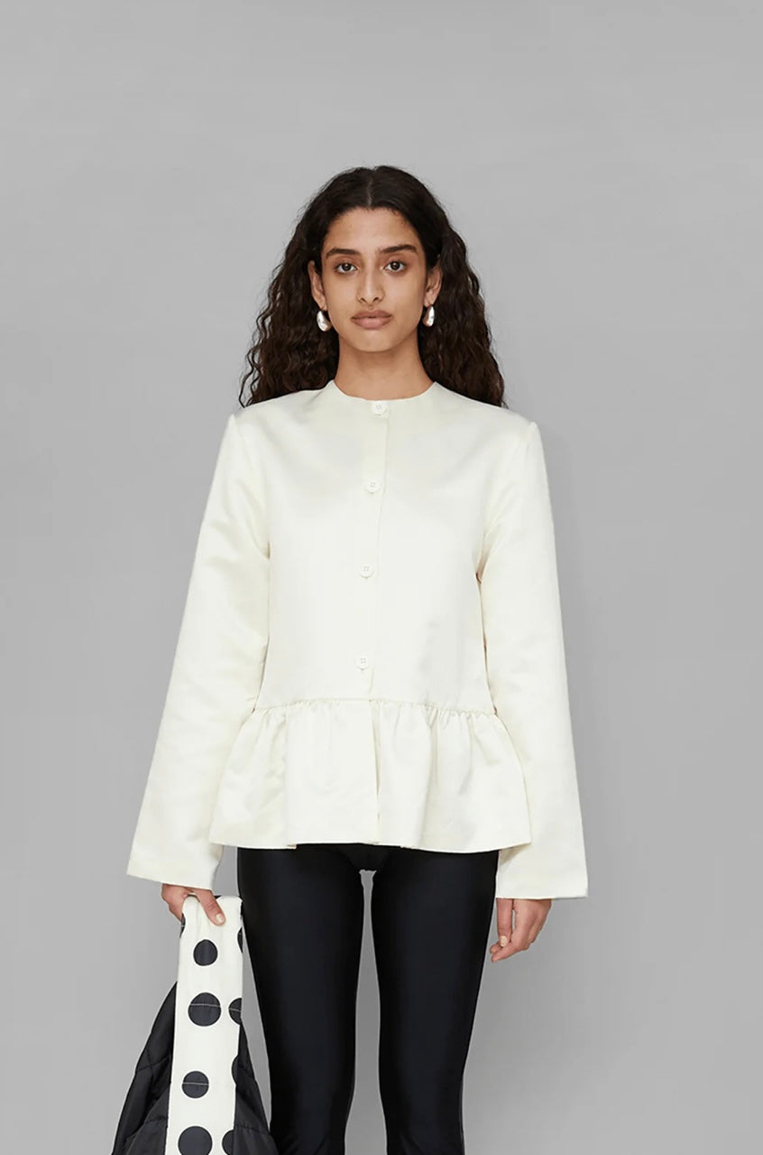Our Yuna Jacket is crafted from 100% recycled polyester. This elegant cream-white jacket features a flattering waistline with a gentle flare, finished with long sleeves and a minimal round neckline. It closes at the front with buttons, making it a versatile piece that blends polished structure with playful detail.