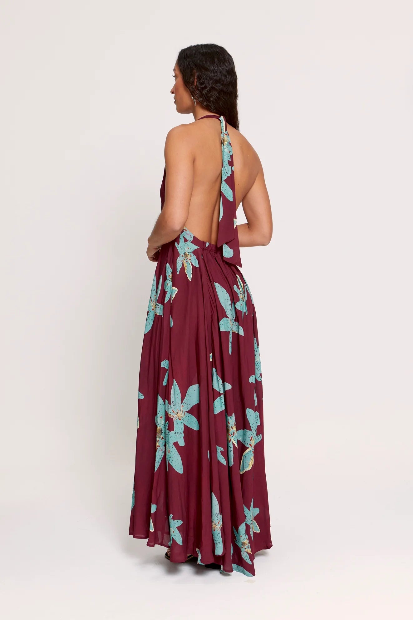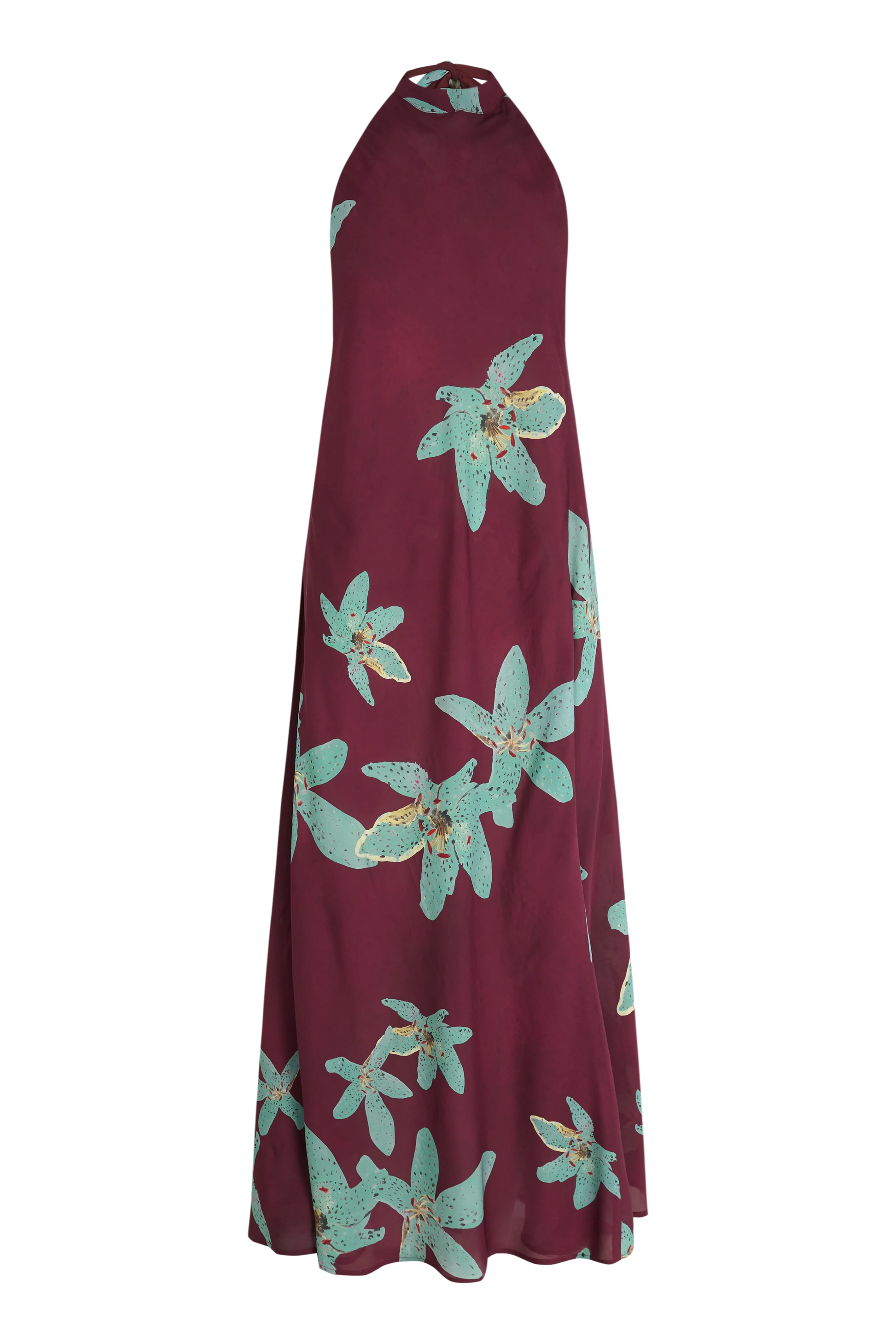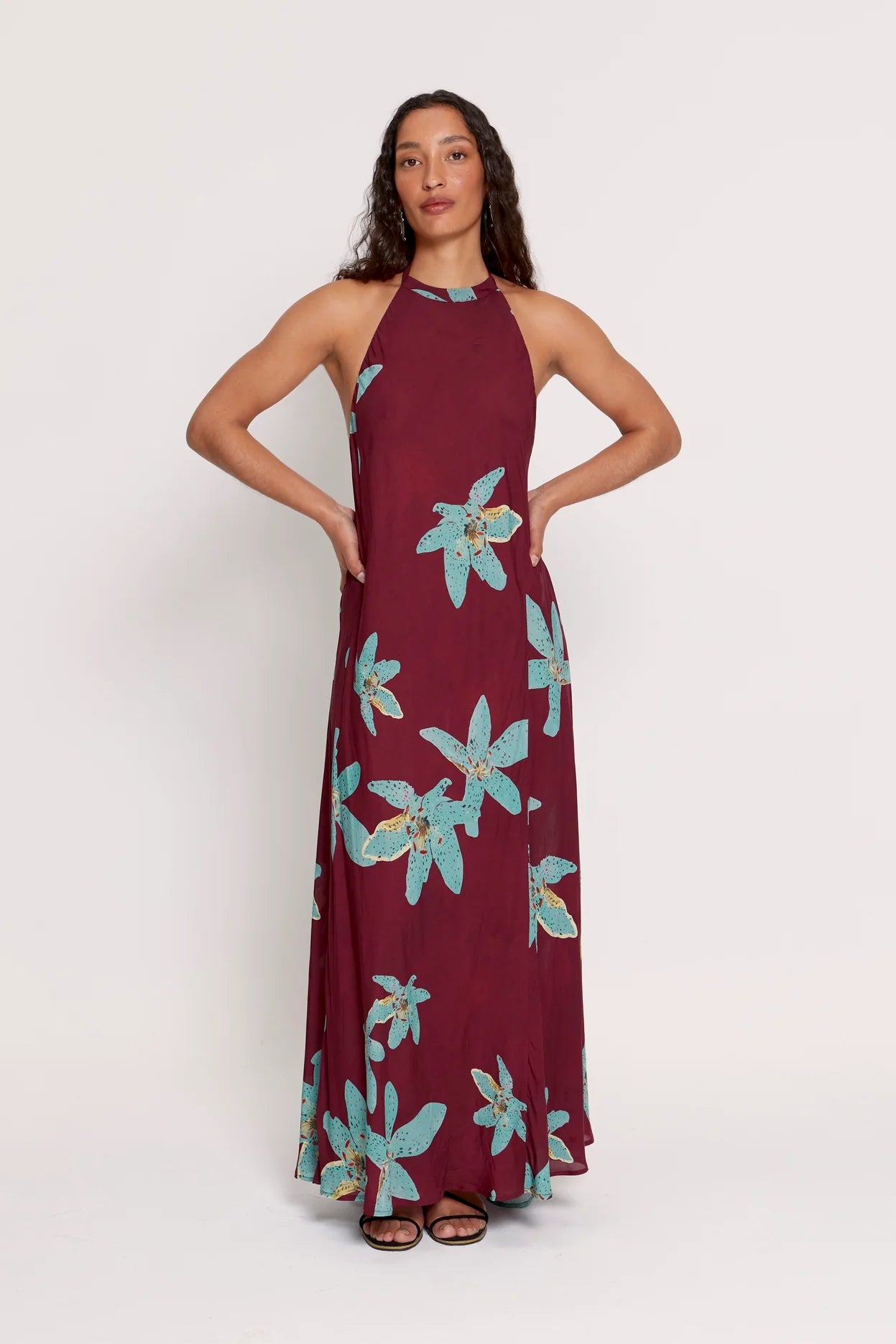 Flowing long dress. Halter neckline and deep open back. Floral design in orange tones with a tiger-stripe pattern within a black background, hand-painted by Romualda's creative director.