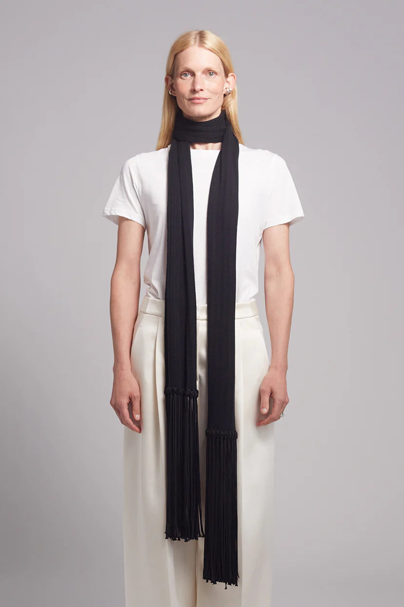 Dramatic long tassels at scarf ends in 100% Viscose Tape