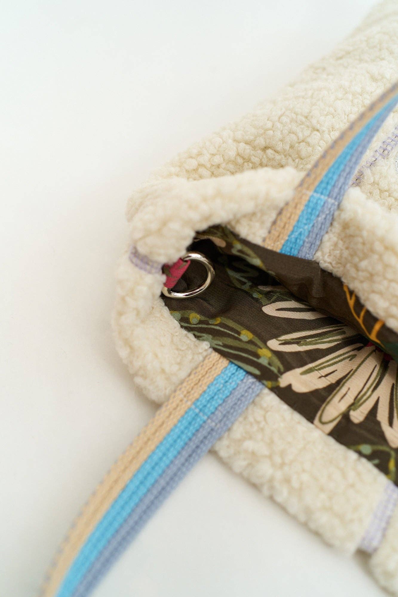 Made from dead stock fabrics, this faux shearling sherpa tote bag in white is an eco-friendly way to carry your stuff around in style. The Lost Pattern team uses only materials that were left over from other projects, so this bag has a story as rich as its look. The dog motif is embroidered with 100% silk fabric and it is unique on each bag. The inside lining is made of viscose printed with our in-house designs, which is like a little hidden piece of art.