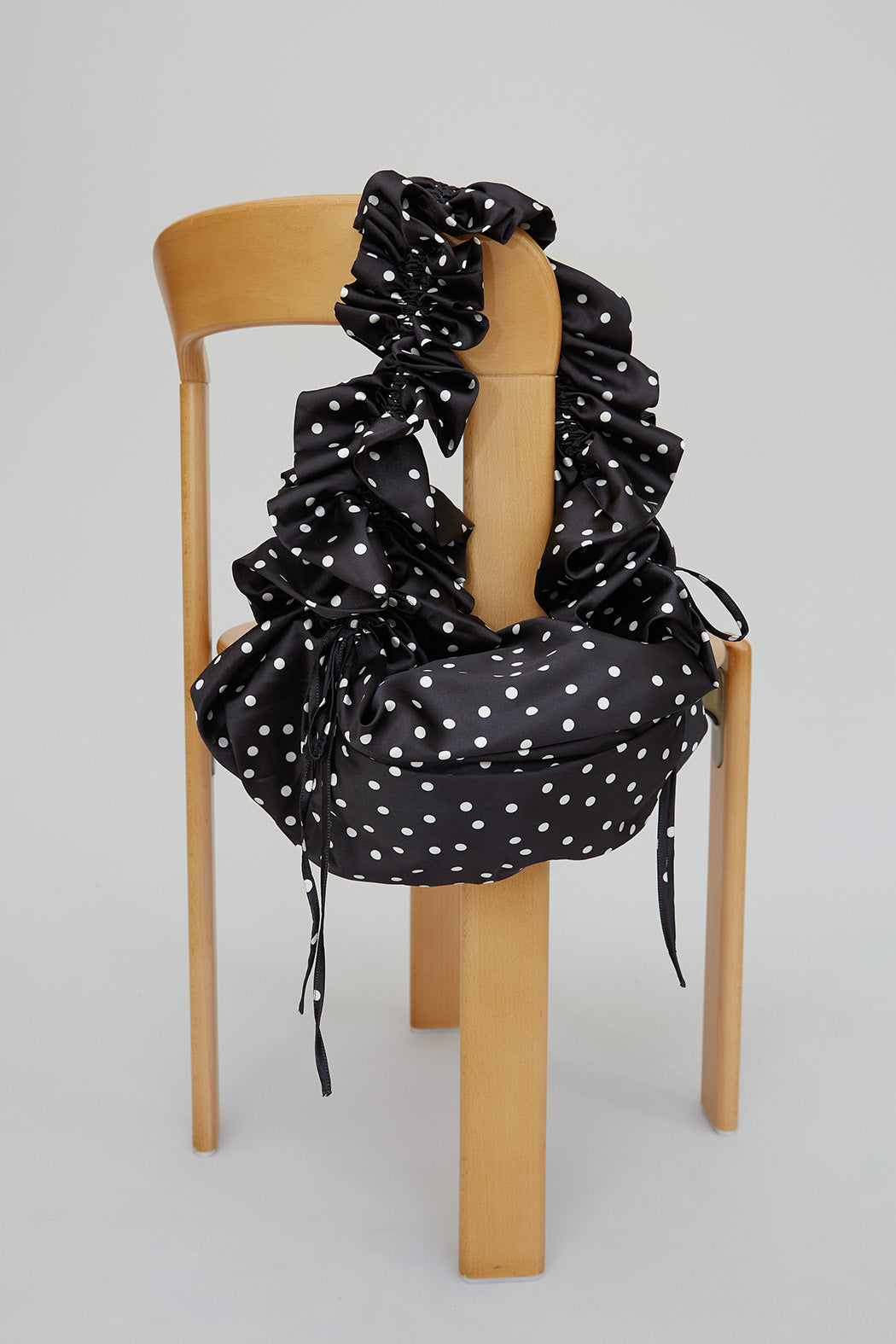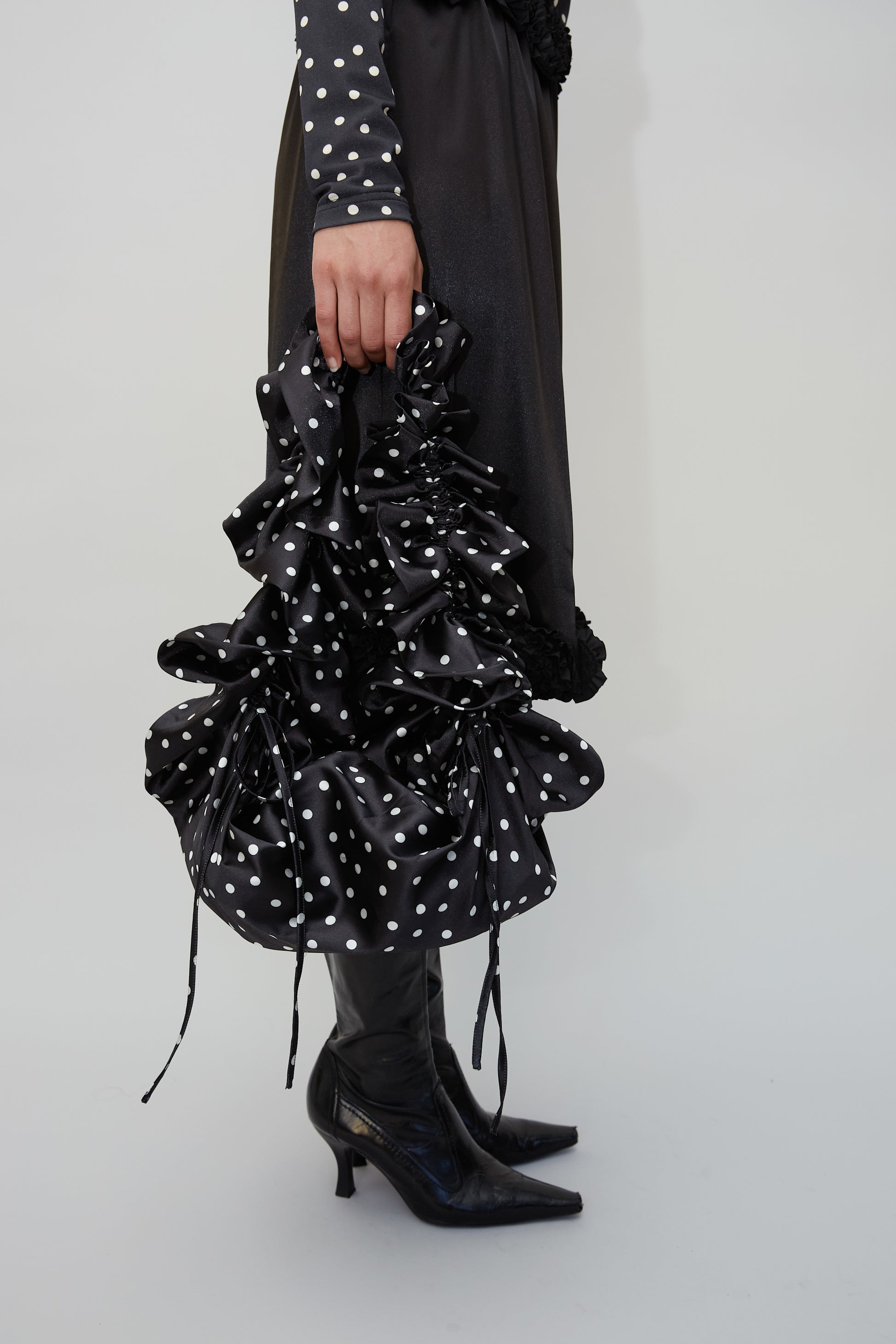The eye-catching Shirley Bag is crafted from 100% recycled polyester in a black base with white dots. It features an adjustable strap and ruffle detailing. Designed for versatility, it can be worn over the shoulder, crossbody, or styled as a handbag.